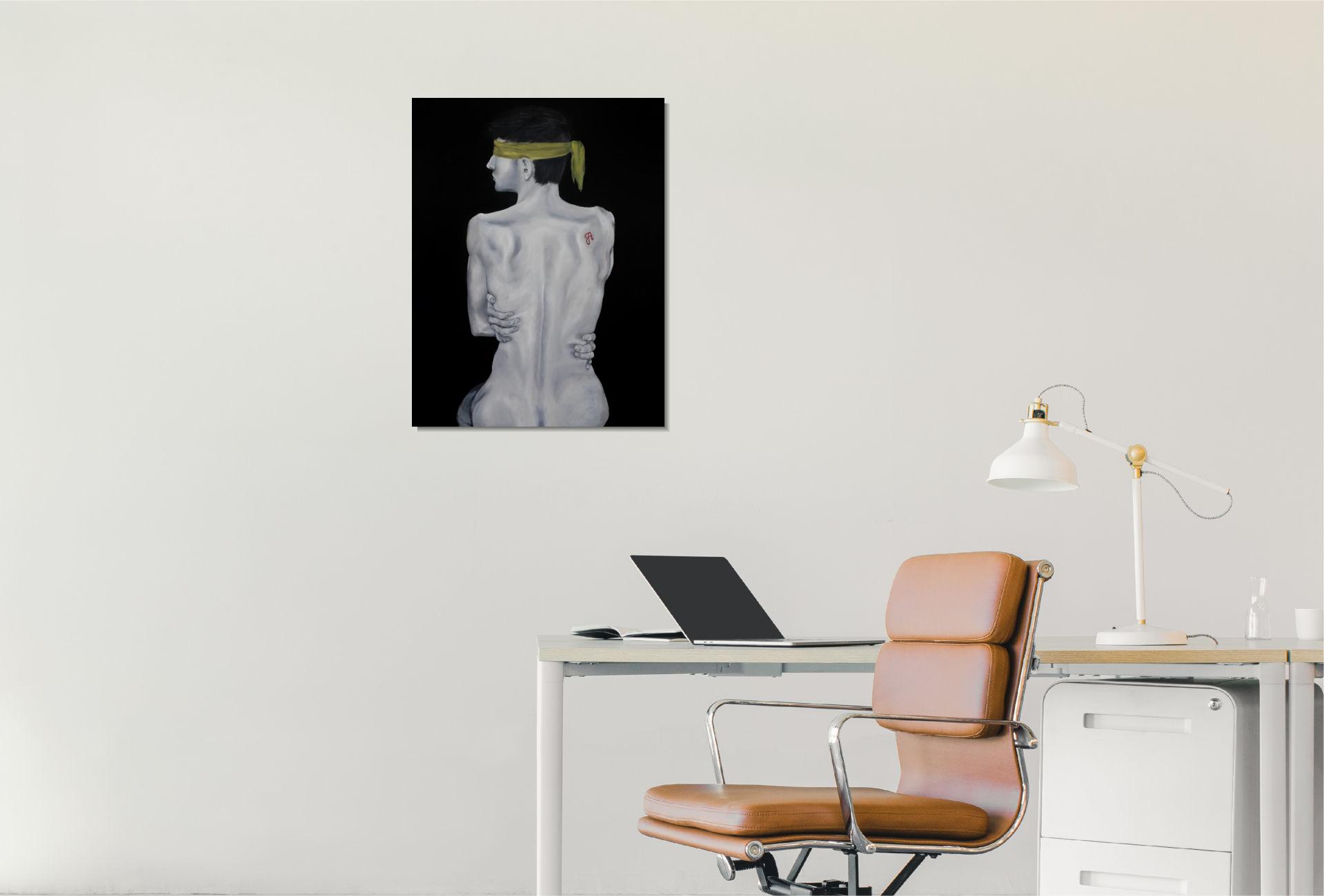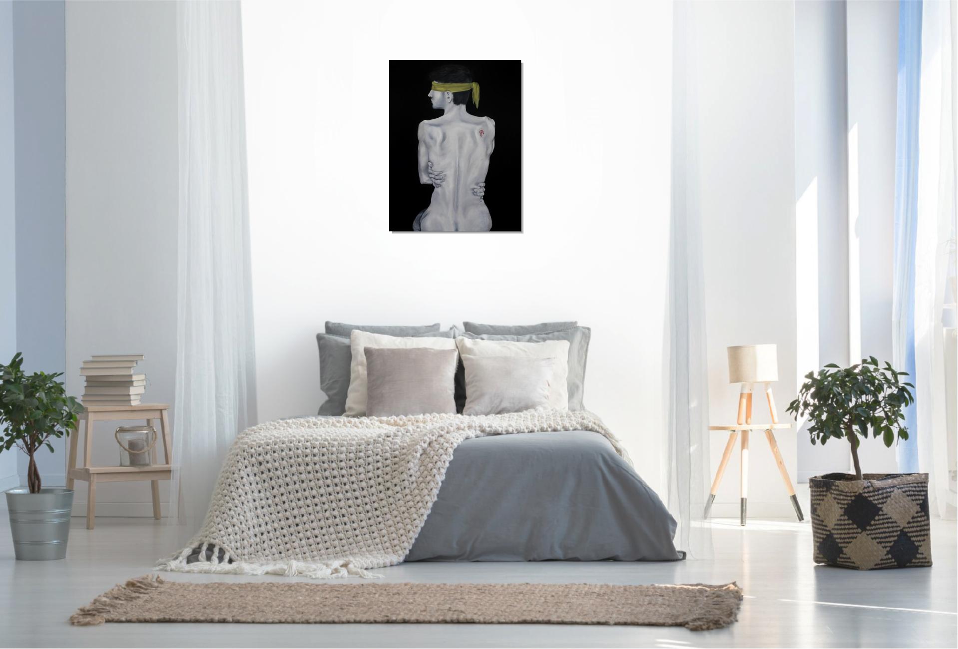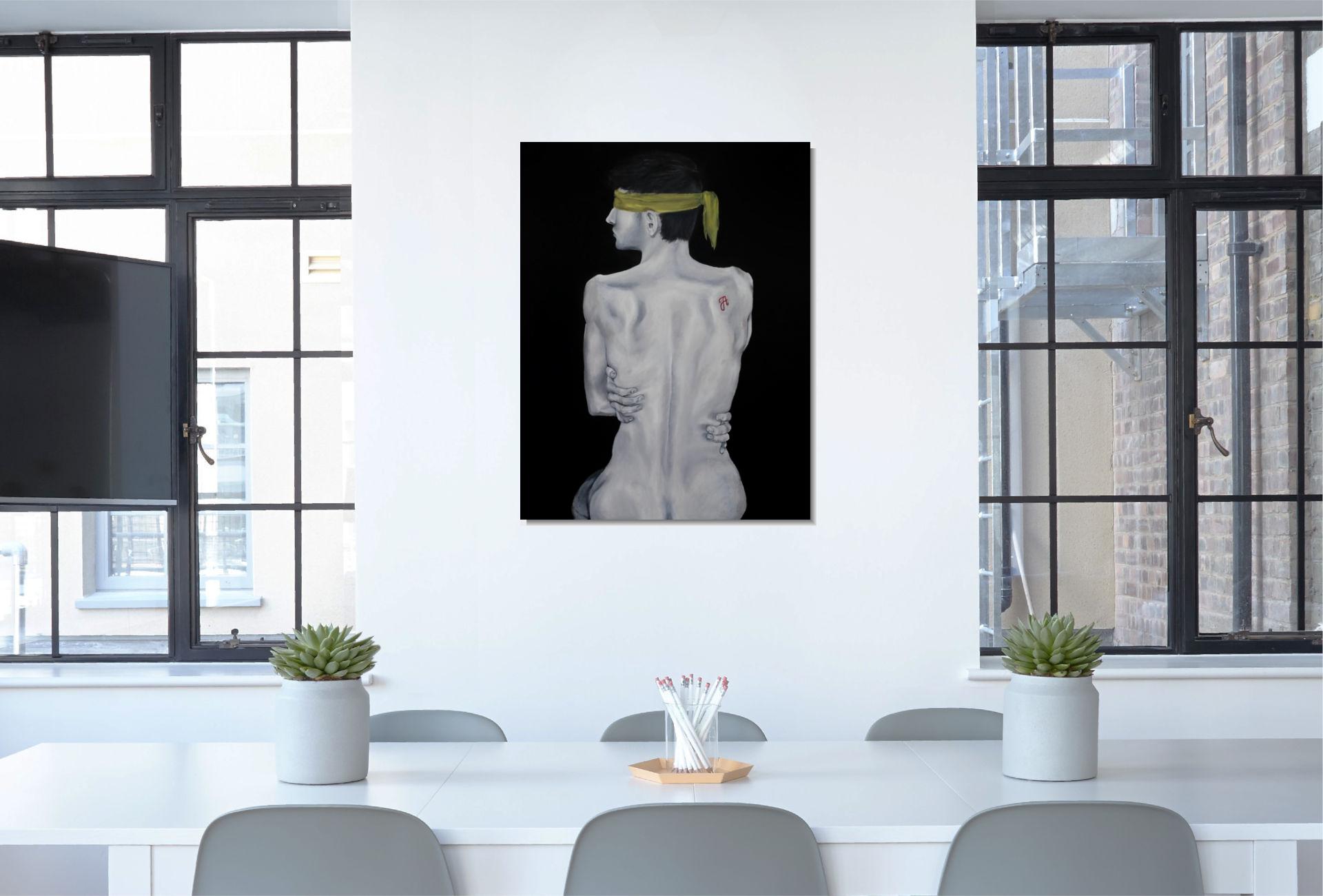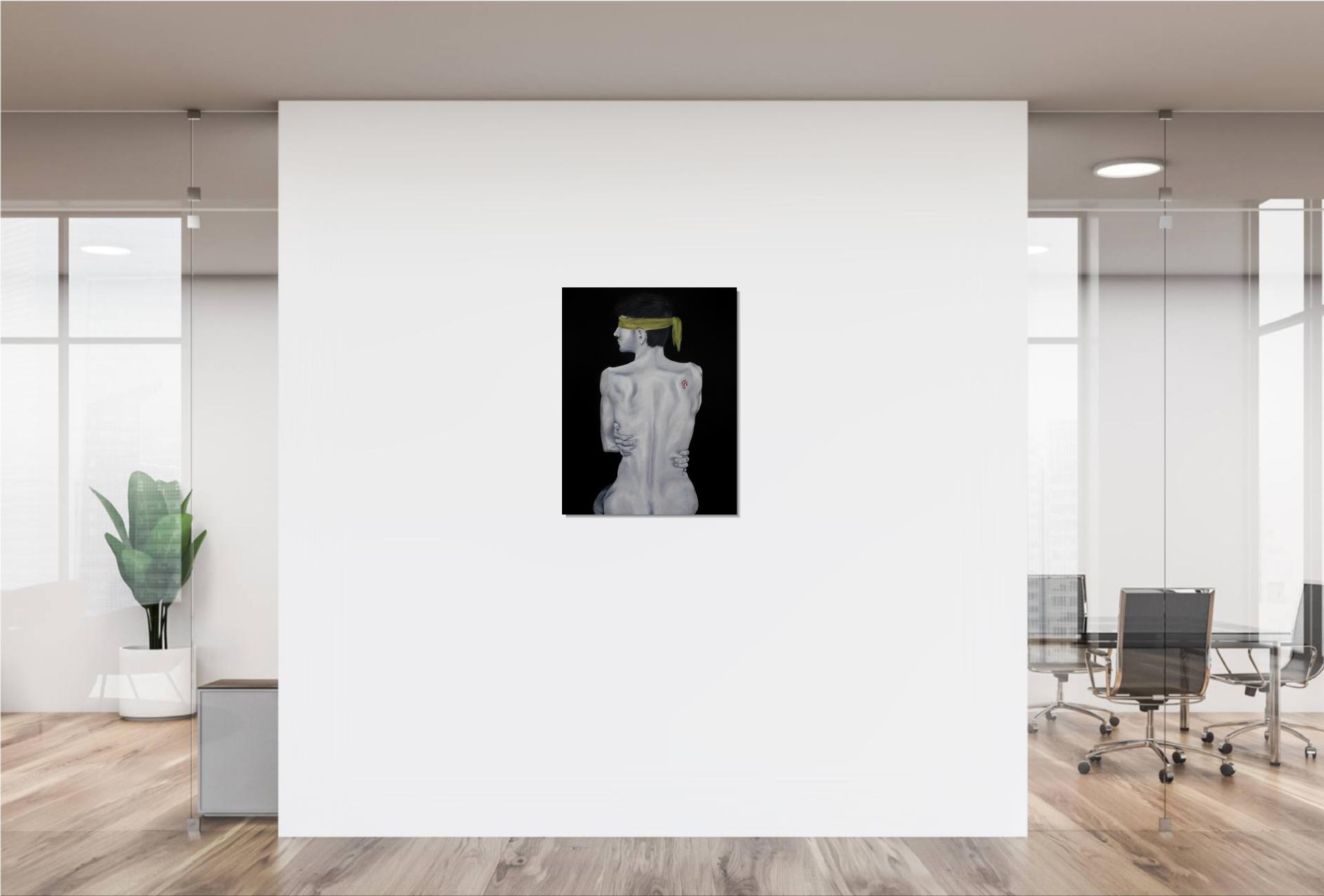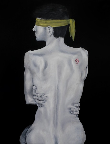 A sárga kendő a megkötözöttséget és a kiközösítés, szégyen terhét jelképezi, mely elfedi a tekintetet. A háton lévő skarlát „A” betű a megbélyegzés szimbóluma, míg az önmagát átölelő kéz a zárkózottságot, a külvilágtól való elhatárolódást fejezi ki.