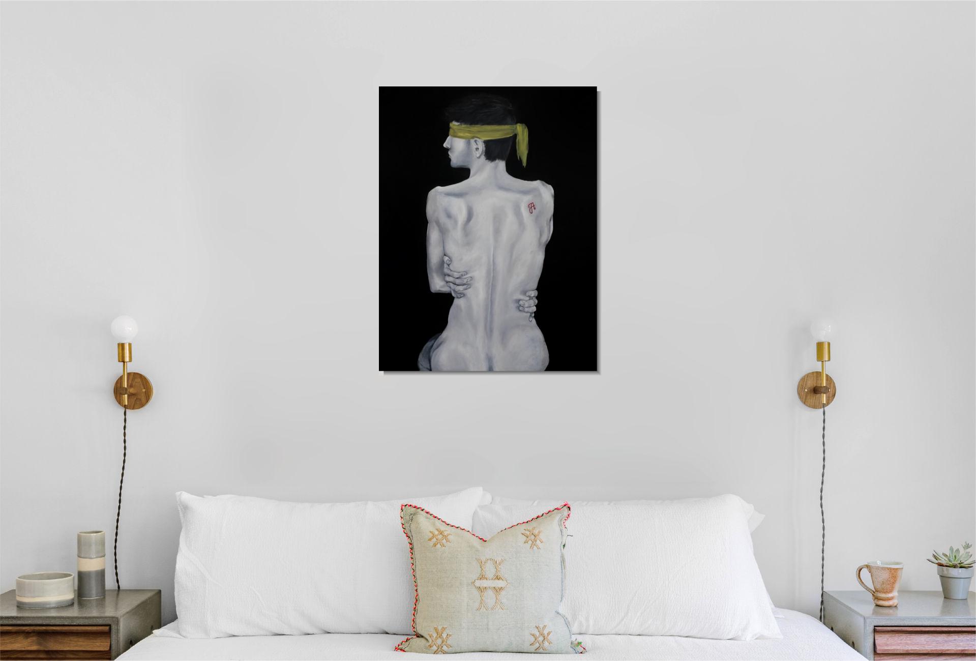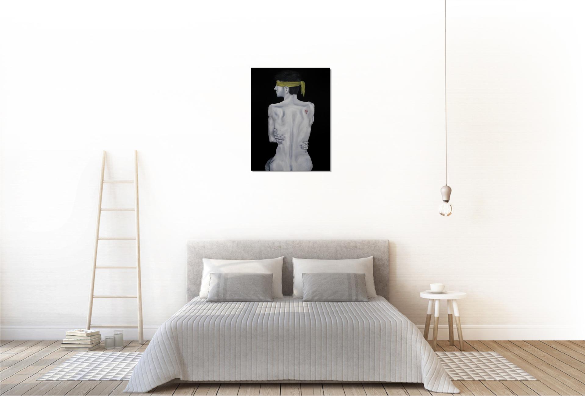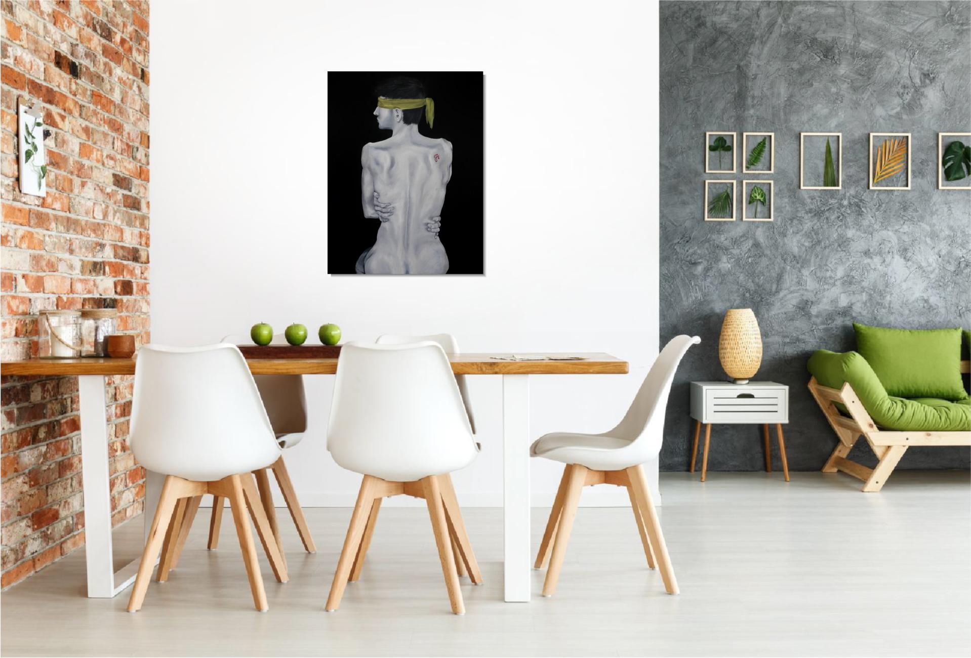A sárga kendő a megkötözöttséget és a kiközösítés, szégyen terhét jelképezi, mely elfedi a tekintetet. A háton lévő skarlát „A” betű a megbélyegzés szimbóluma, míg az önmagát átölelő kéz a zárkózottságot, a külvilágtól való elhatárolódást fejezi ki.