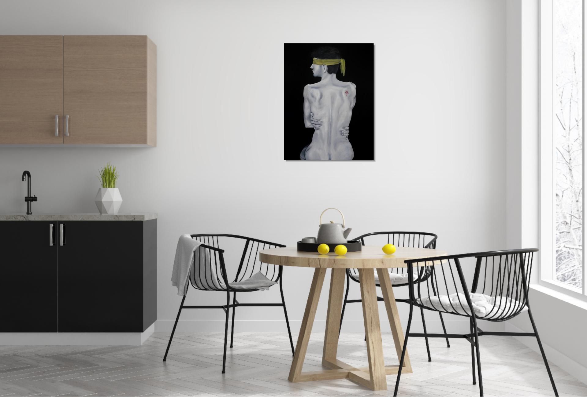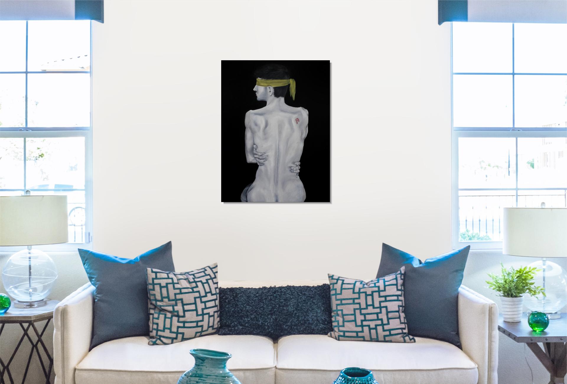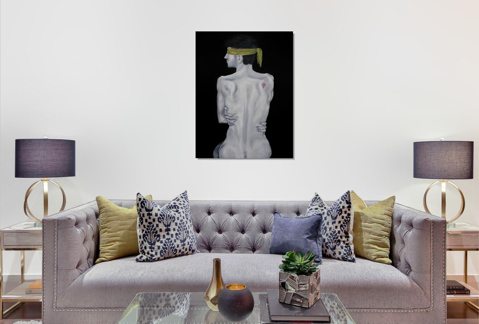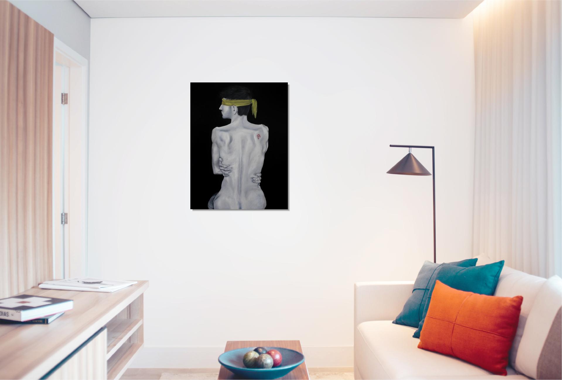 A sárga kendő a megkötözöttséget és a kiközösítés, szégyen terhét jelképezi, mely elfedi a tekintetet. A háton lévő skarlát „A” betű a megbélyegzés szimbóluma, míg az önmagát átölelő kéz a zárkózottságot, a külvilágtól való elhatárolódást fejezi ki.