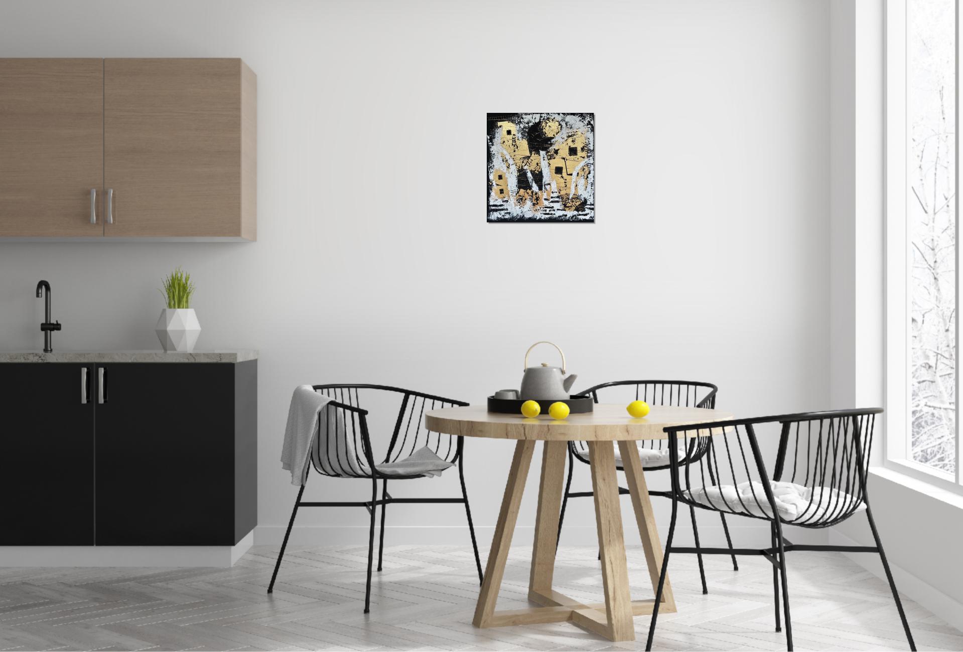 A festmény kiüresedett város, elnéptelenedett utcák, elhagyott épületek, pára, fények, tükröződések eklektikája
